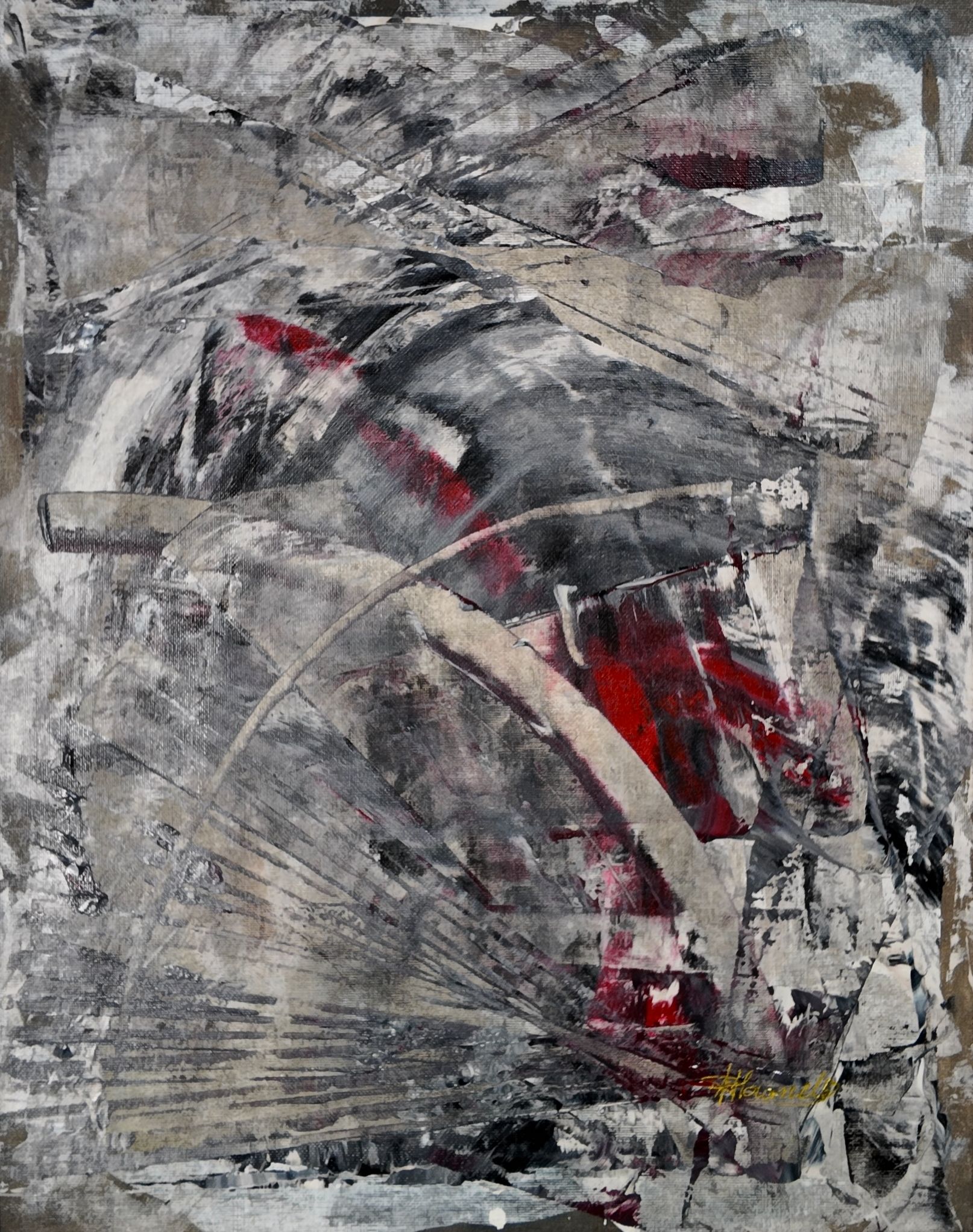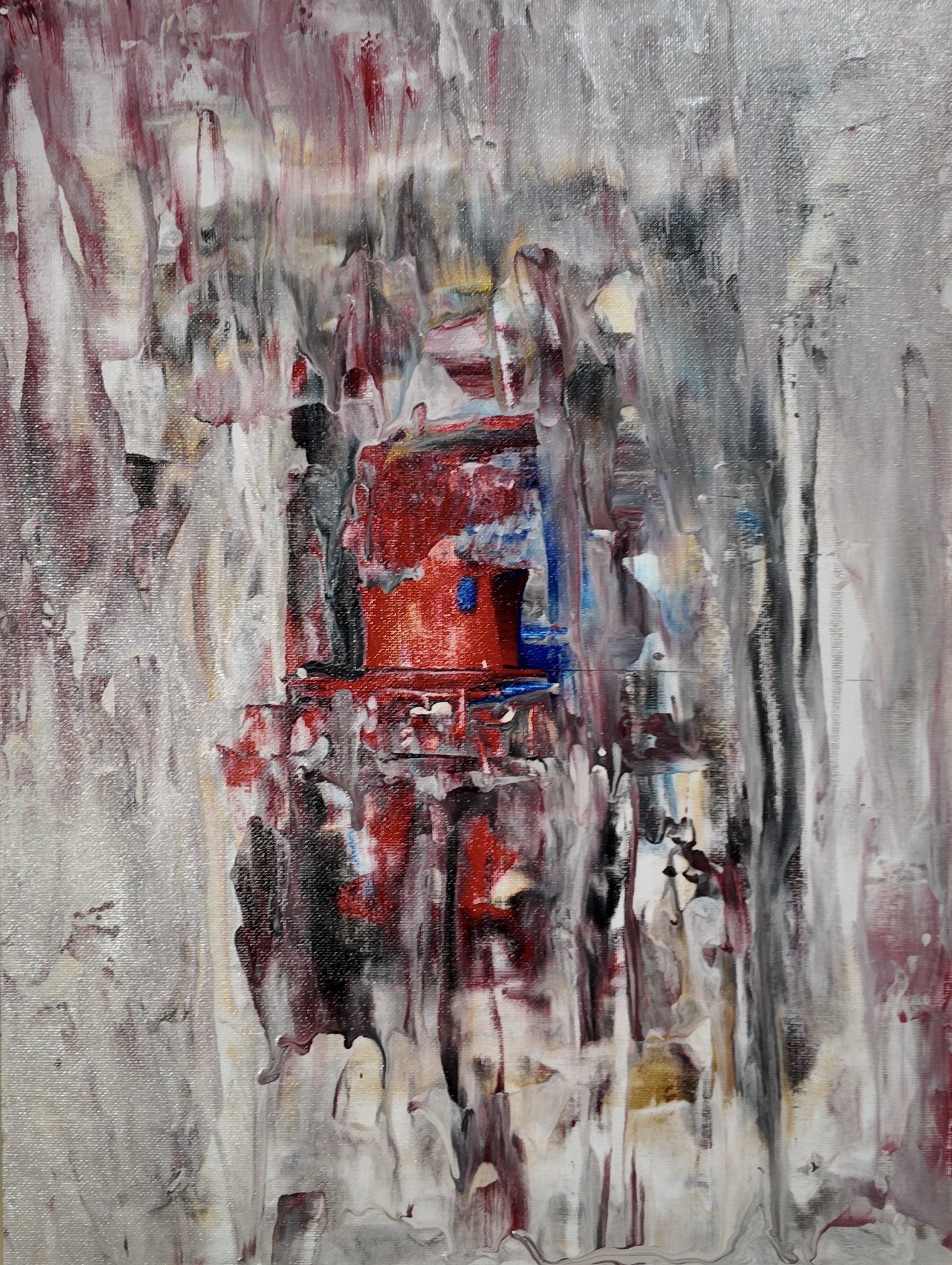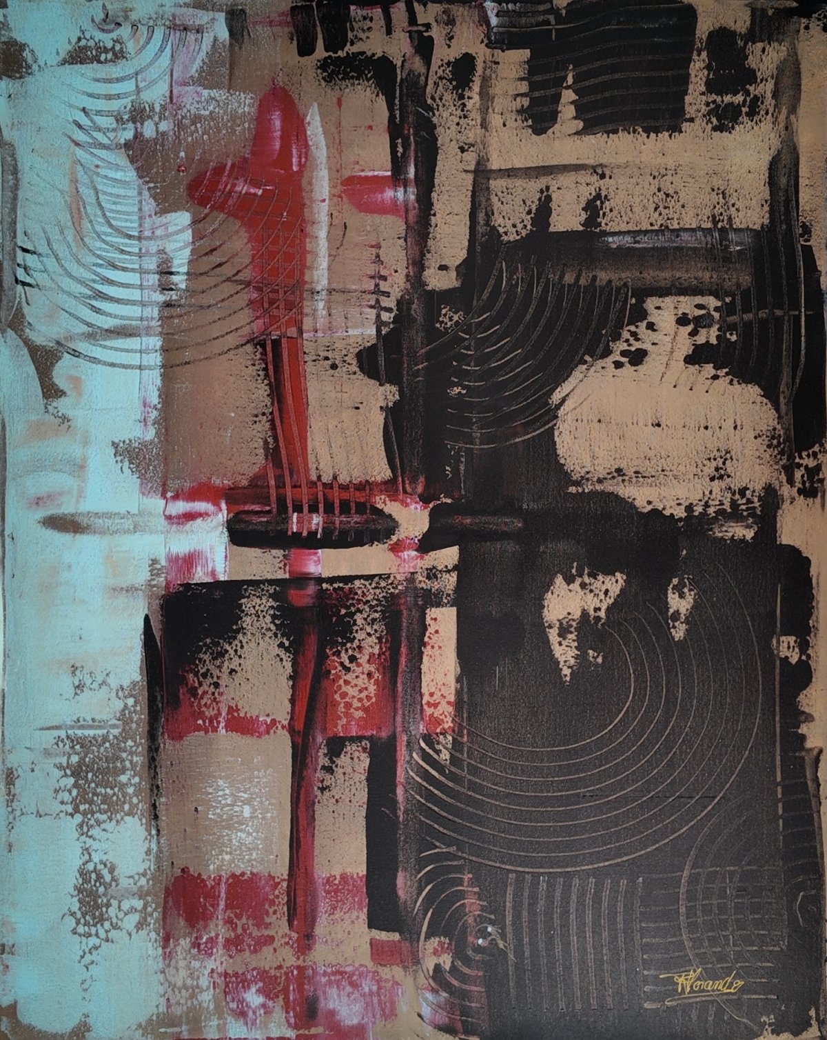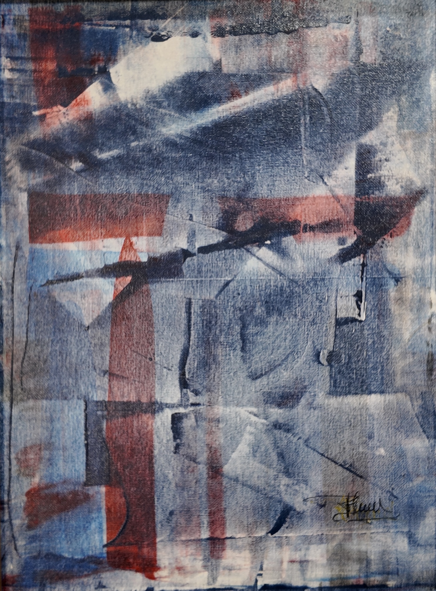 À la frontière mouvante entre l’ordre et l’éclatement, cette œuvre explore les tensions intimes du monde intérieur. Les noirs profonds s’enlacent aux éclats rouges comme des pensées qui s’entrechoquent, tandis que le bleu clair tente une percée, fragile mais tenace. Chaque coup de pinceau semble hésiter entre la retenue et l’abandon, c est comme capturé l’instant précis où le chaos devient langage. C’est une cartographie émotionnelle, un paysage abstrait où l’œil se perd et se retrouve, au gré des textures et des silences.
